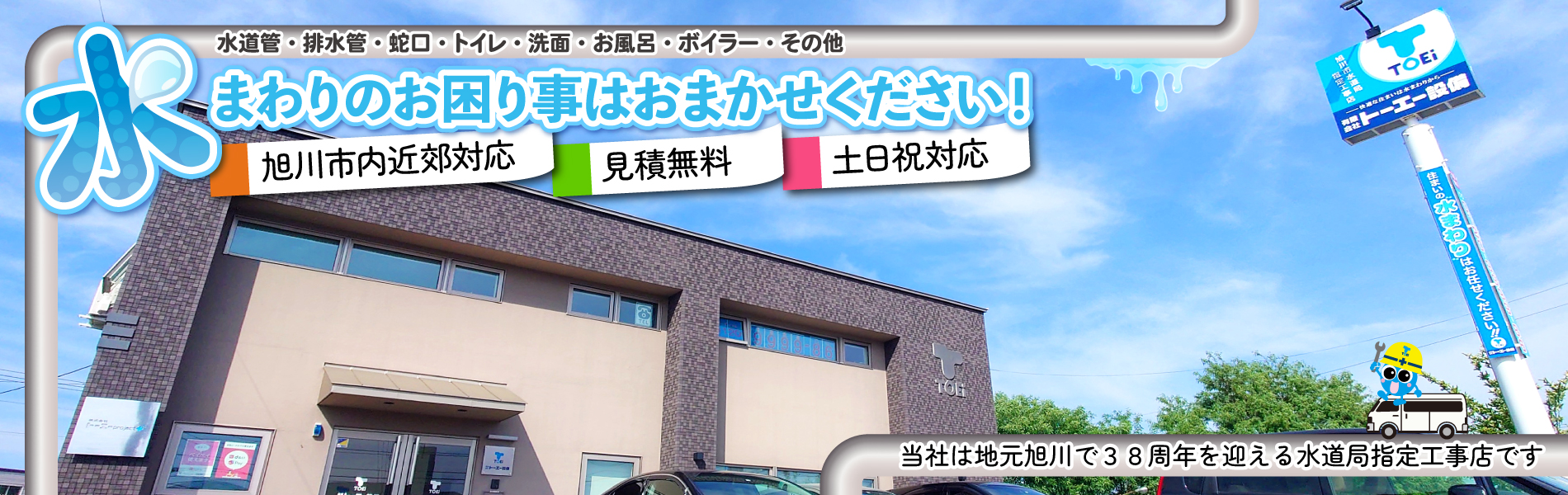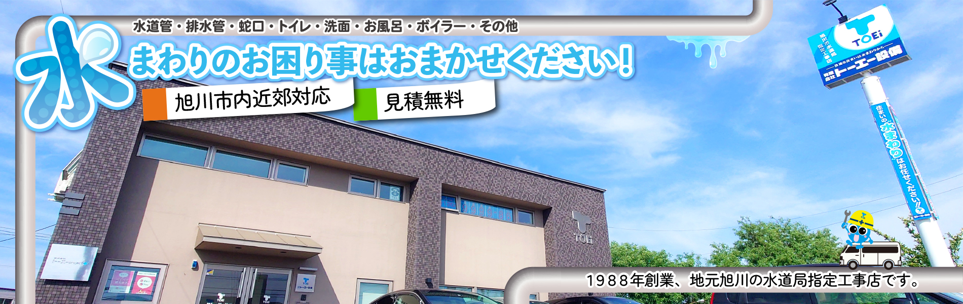 住宅設備にかかわるさまざまなトラブル(水漏れ、つまり、凍結、上下水道・給排水工事、換気扇などの住宅設備機器設置・保守など)が発生した時、どこに頼んだらいいのかと不安になるお客様も多いと思います。トーエー設備は旭川で38周年を迎える会社です。7台のサービスカーのうち、一番早く駆け付けられるスタッフが向かいます。お客様の不安を少しでも早く解決できるよう心掛けております。