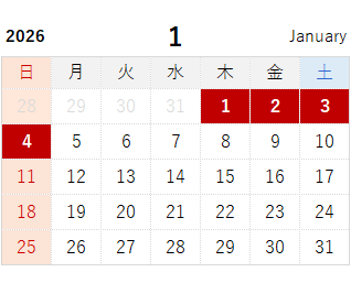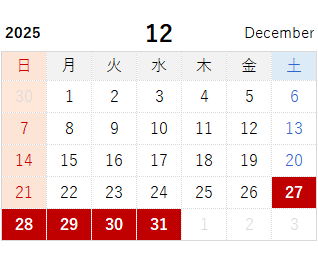 年末年始の休業日につきまして、2025年12月27日(土)~2026年1月4日(日)まで年末年始休業日とさせていただきます。